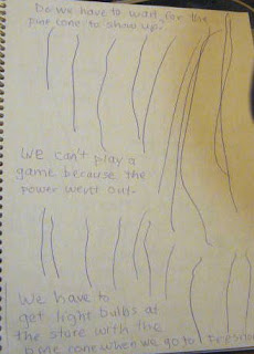 This is what Aidan did for a long time one evening. He was watching me write in my journal and then said he wanted to do a "reading lesson". That meant telling me stories that I could write down. It evolved to Aidan "writing" what he wanted to write (he is the one who was writing the long straight up and down lines) and then I would transcribe what he said it said.